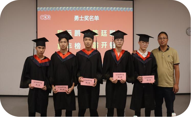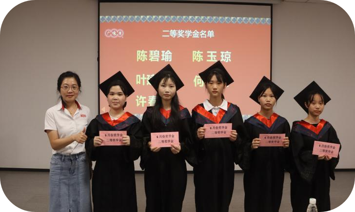 畢業(yè)典禮前廣味源人力資源部施華經(jīng)理與生產(chǎn)部張光良經(jīng)理、生管中心李勝龍經(jīng)理、品管部劉雪瑩經(jīng)理為畢業(yè)生頒發(fā)了畢業(yè)前最后一次獎學金,為他們的跟崗實習劃上圓滿句號。
