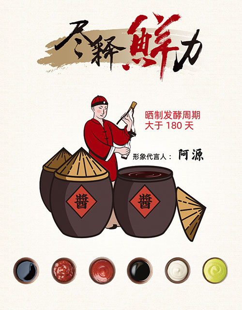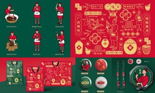 包裝上,廣味源將品牌視覺年輕化,結(jié)合年輕人喜歡的國潮文化元素打造了一套統(tǒng)一的視覺VI識別系統(tǒng),塑造IP阿源的形象,從品牌層面顛覆年輕人對于傳統(tǒng)醬油企業(yè)的刻板印象。