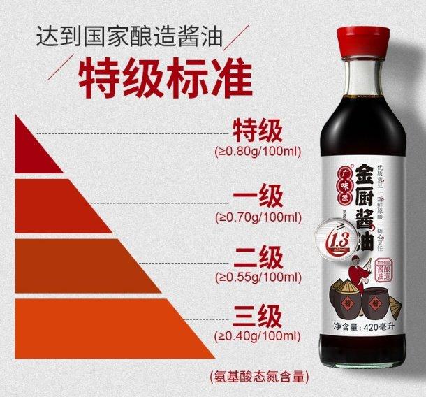 金廚醬油鮮度檢測數(shù)據(jù)顯示,“金廚醬油”氨基酸態(tài)氮含量≥1.3g/100ml,遠(yuǎn)遠(yuǎn)高于國家醬油釀造標(biāo)準(zhǔn)的0.8g/100ml特級標(biāo)準(zhǔn),“鮮醇”度遠(yuǎn)超國家標(biāo)準(zhǔn),產(chǎn)出地地道道的頭道新鮮原釀。